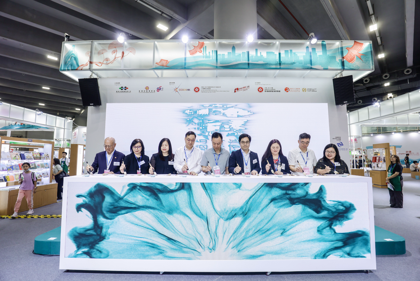 - 為推廣本港優質與創新的文創產業,由香港出版總會及香港印刷業商會合辦,文創產業發展處資助的「騰飛創意-線上線下香港館」項目(下稱「騰飛創意」項目),今年首辦「大灣區書店閱讀巡禮」(下稱「巡禮」),早前順利完成澳門站和中山站後,12月15日到明年1月5日在佛山古鎮新華悅讀空間舉行佛山站,展銷約1800本香港精選圖書,是跨年至2025年的印刷與出版業界粵港澳大灣區的文化交流盛事。為隆重其事,香港出版總會及香港印刷業商會,於12月15日下午三時為佛山站舉行開幕儀式,恭請佛山市委宣傳部副部長汪精華先生、香港特別行政區政府文創產業發展處總監(建築、印刷出版及推廣)戚芷筠女士、「騰飛創意-香港館」項目籌委會主席陳儉雯女士、2024南國書香節「香港館」暨大灣區書店閱讀巡禮主席葉佩珠女士、佛山市禪城區委宣傳部常務副部長、區文化廣電旅游體育局局長楊濤先生、中華商務贸易有限公司董事長王凱先生、佛山市委宣傳部出版版權科科長勞燕貞女士、佛山市禪城區委宣傳部副部長及區新聞出版(版權局)局長彭迪麗女士,聚首一堂主持剪綵儀式,正式為展期為期22天的巡禮佛山站揭開序幕。