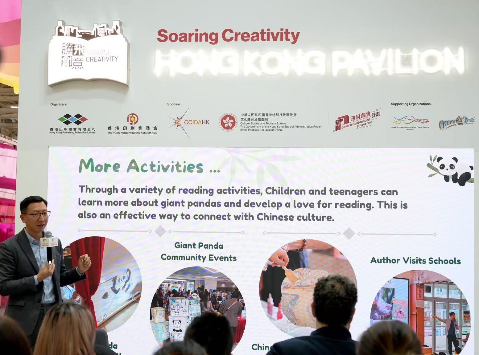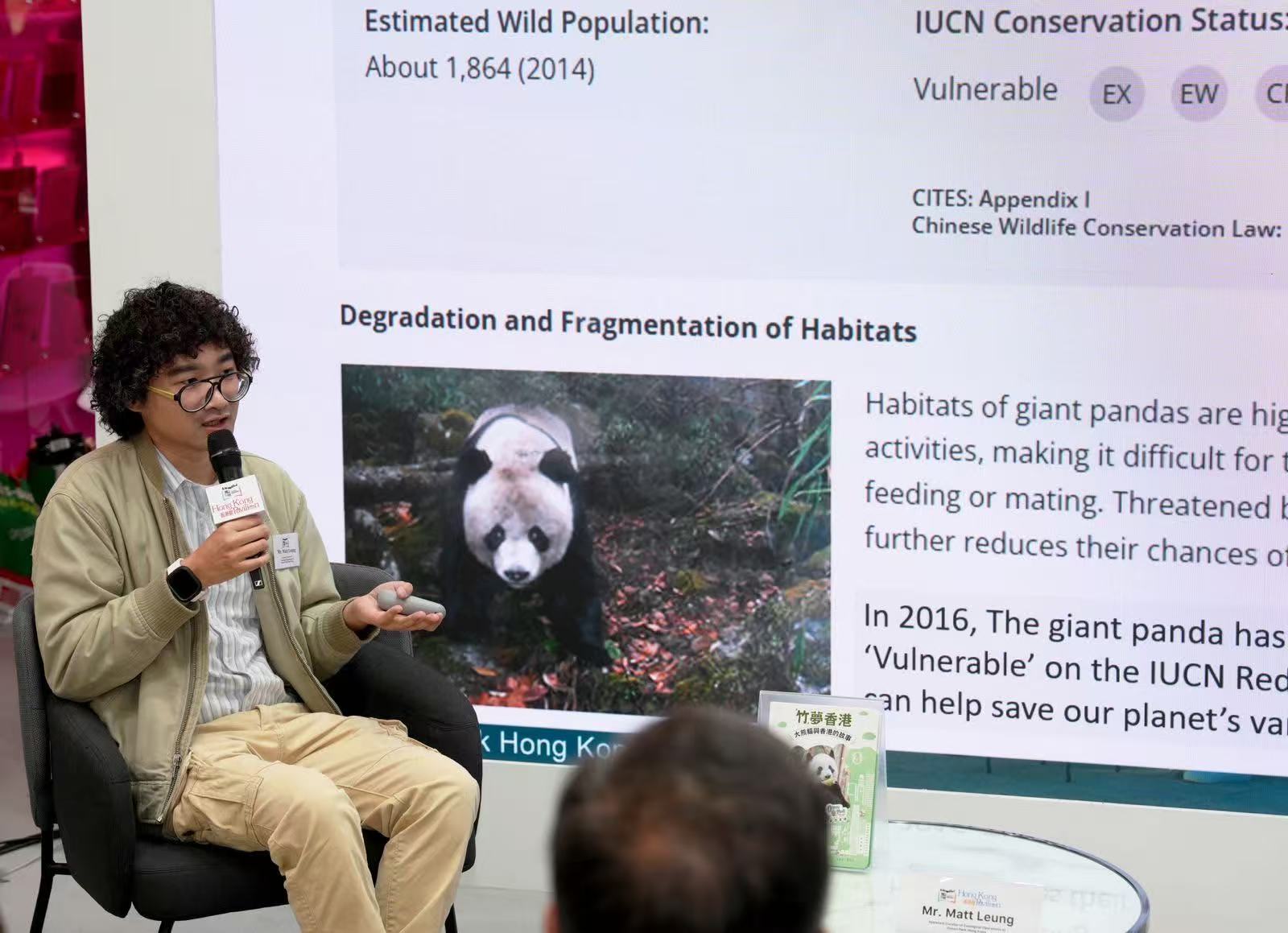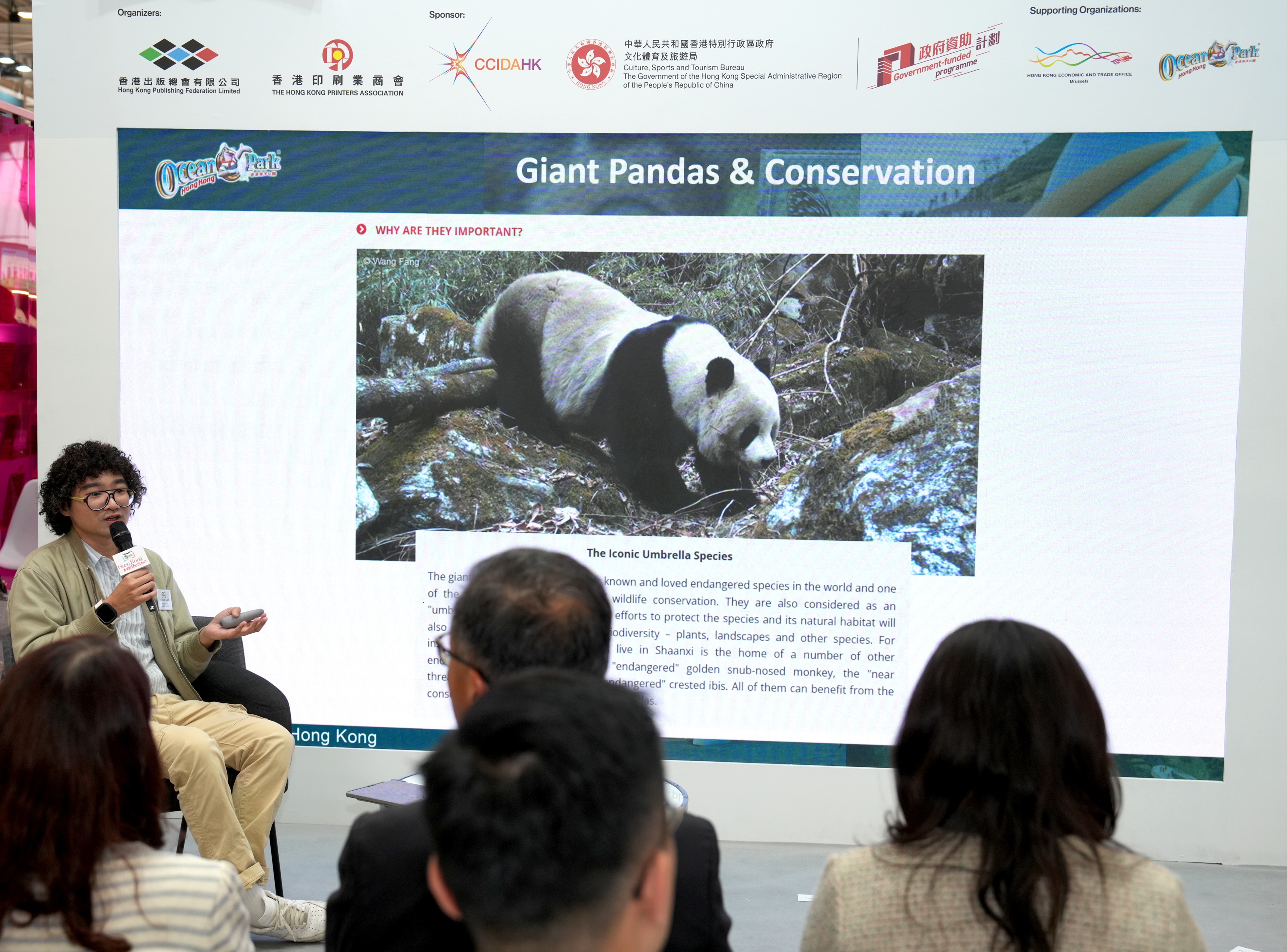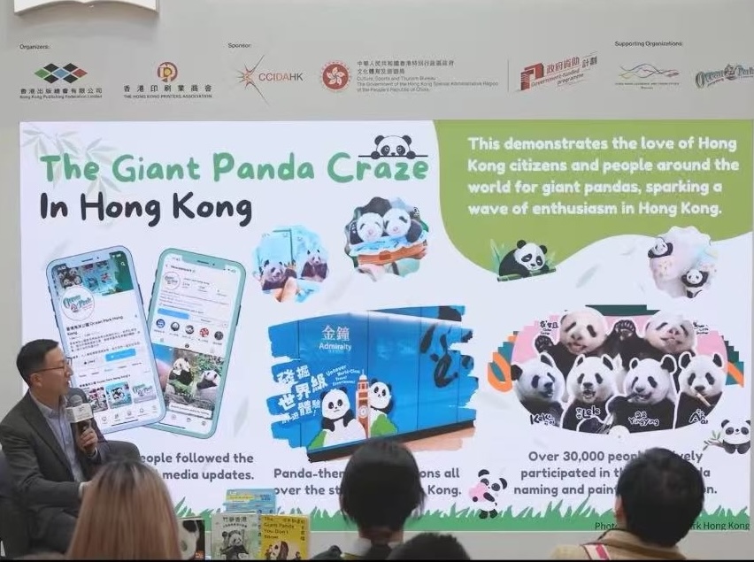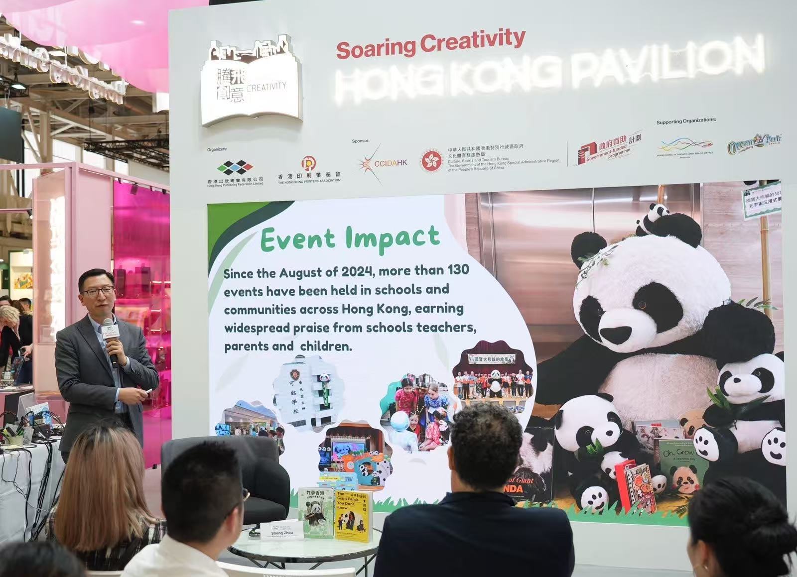 - 由香港出版總會及香港印刷業商會合辦、文創產業發展處資助的2025年博洛尼亞兒童書展「香港館」,首場文化活動於3月31日(意大利時間)舉行,由香港海洋公園的助理館長梁家綸先生打響頭炮,他以「我們的大熊貓 - 香港海洋公園的保育故事」為講題,為現場觀眾帶來了一場深入且充滿溫情的分享會,吸引了眾多參觀者駐足聆聽,現場座無虛席。 梁家綸(Matt)是香港海洋公園的助理館長,專責大熊貓逾14年。他並憑藉照顧不同動物,對動物訓練原理有著深刻的了解,擁有大熊貓護理方面的專業知識。梁家綸在海洋公園的工作包括照顧大熊貓的健康及福祉,同時亦透過日常工作提高公眾的保育意識。 梁家綸先生在分享會中提到,大熊貓在香港深受市民喜愛,是極具標誌性的動物大使。牠們代表了香港海洋公園多年來在動物護理、保育和教育方面的使命與承諾。訪客遊覽海洋公園時不僅可以欣賞到大熊貓的可愛面貌,更可了解牠們在香港的獨特故事,以及公園在保護大熊貓方面的工作。透過世界級的動物護理,海洋公園不僅為遊客帶來歡樂,更推動了動物福祉、保育及科研。透過香港大熊貓的故事,期望提高大眾保護大自然的意識,並將這份使命傳承給下一代。 梁家綸先生的專業分享不僅展現了香港海洋公園的保育使命,也為「騰飛創意—香港館2025」的首日活動增添了深刻的文化內涵與教育意義。