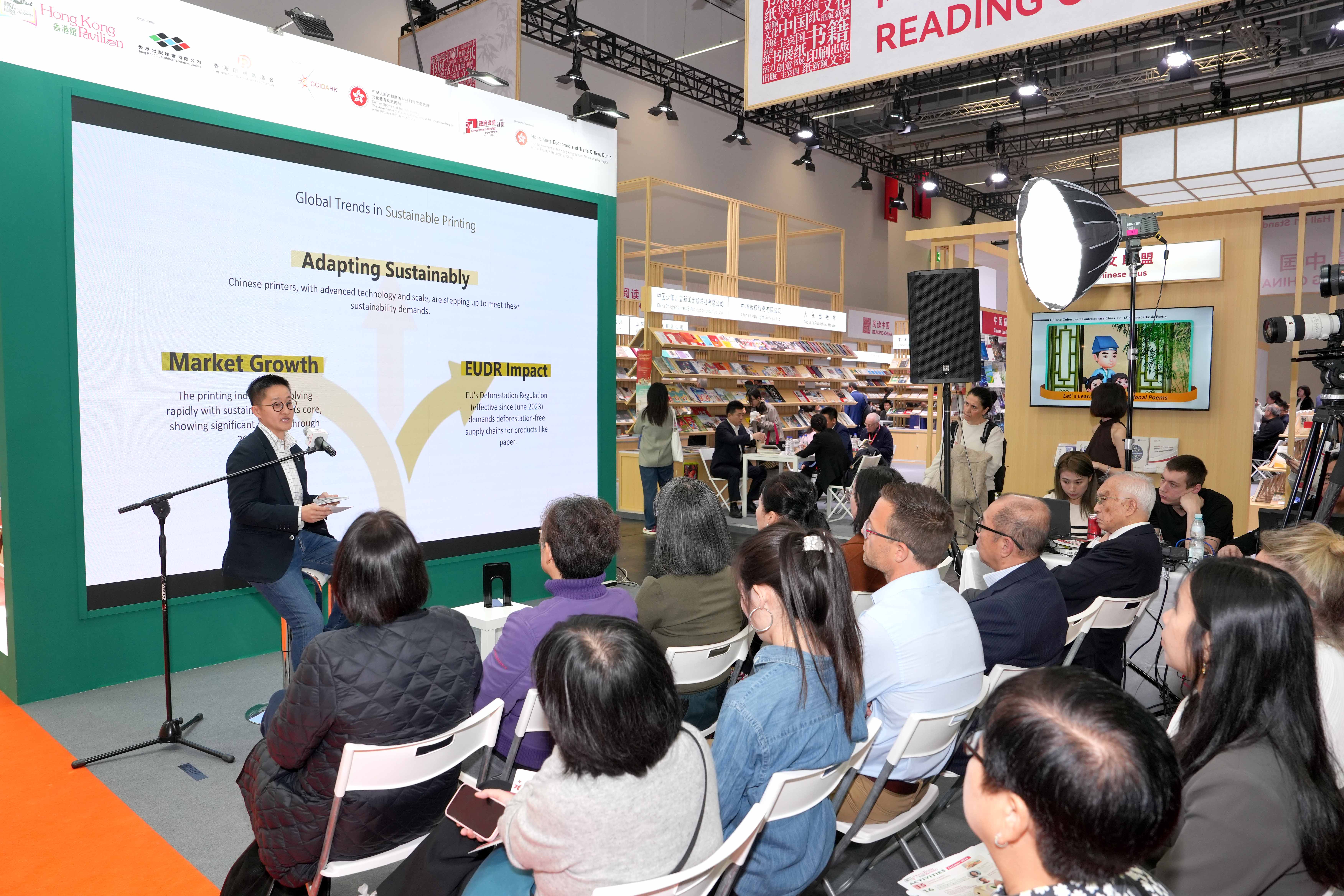 - 2025年法兰克福书展「香港馆」特别邀请了贝路加集团(Beluga Limited)首席商务官的执行助理及环境、社会与治理 (ESG) 经理章颖恩女士(Ms. Rachel Cheung),以【人工智能、可持续发展、欧盟防砍伐法规及中国印刷商】为主题作分享。她的分享探讨了人工智能如何革新可持续柯式及数码印刷,确保符合欧盟防砍伐法规(EUDR),并促进与中国印刷商合作。人工智能促进透明合作,建议审计供应链、试点合作,利用中国技术实现可持续及盈利。通过人工智能,可与全球合作打造绿色、具竞争力的印刷业,满足EUDR及市场需求。